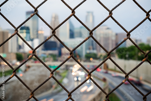 Long exposure shot of 24th Street pedestrian bridge, through the fencing over 35W highway. Car headlight trails Minneapolis Minnesota USA