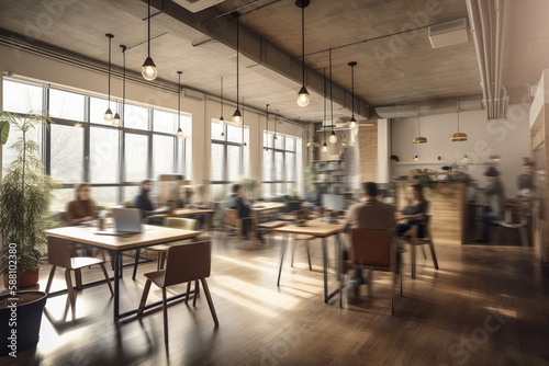 Long exposure shot of modern open space office with business people. Generative AI
