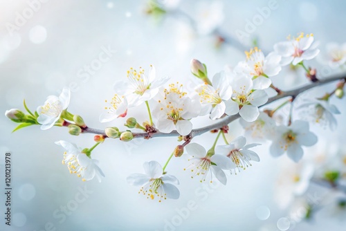 Long Exposure White Flower Branch, Delicate Spring Blossom, Pure White Background