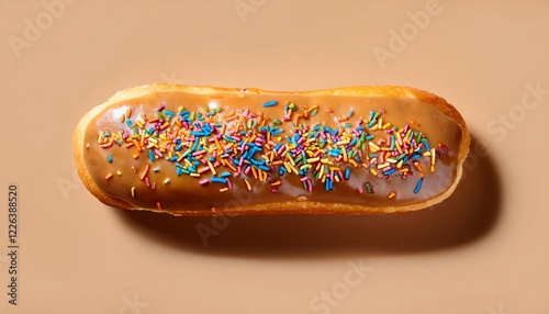 Long John Peanut Butter Donut with Rainbow Sprinkles on Beige Background Isolated
