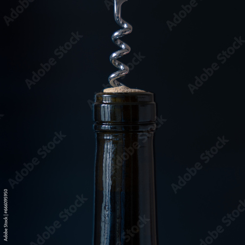 Long narrow neck of wine bottle with corkscrew inserted into cork isolated on black background