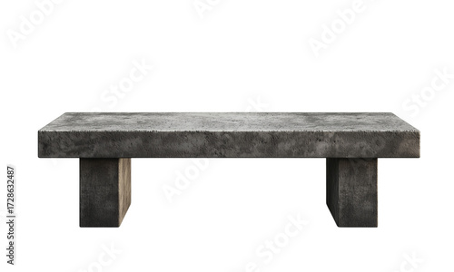 Long rectangular stone bench with a thick slab seat and two block legs, featuring a weathered, textured gray concrete finish.