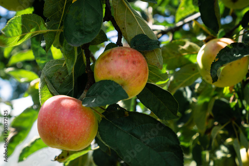 Long red apples on a tree in the summer garden during the day. Ripe juicy sweet fruits with iron and vitamins.