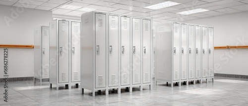 Long row of gray metal school lockers in a clean brightly lit hallway with tiled floo and orange handrails for students