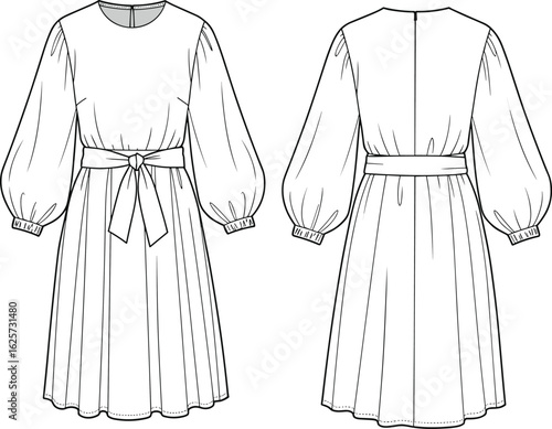 Long sleeve belted midi dress flat sketch, front and back view, technical fashion illustration, cad drawing for clothing design