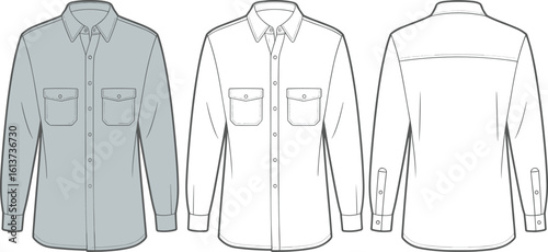 Long sleeve button-up shirt flat sketch, front and back CAD drawing, fashion vector template, technical illustration for apparel design