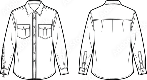 Long sleeve shirt flat sketch, button up design, fashion technical drawing, apparel template, garment construction outline, clothing illustration, detailed front back view