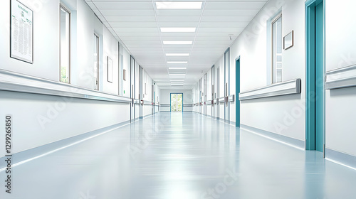Long White Hospital Corridor with Turquoise Doors and Bright Lighting