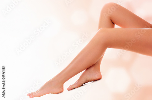 Long woman naked legs with smooth and clear skin. Laser hair removal concept. Abstract background with blurred lights