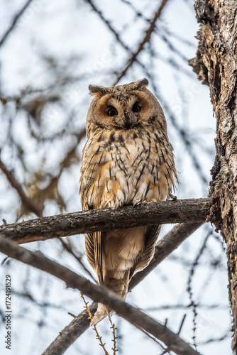 Long-eared owl (Asio otus), looking forward with wide opened eyes