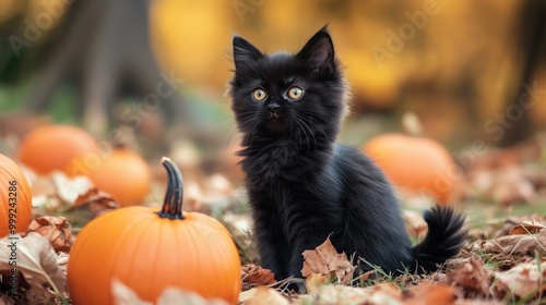 Long-haired black kitten with Halloween pumpkins in an autumn woodland