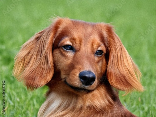 Longhaired dachshund resting calmly on grass field