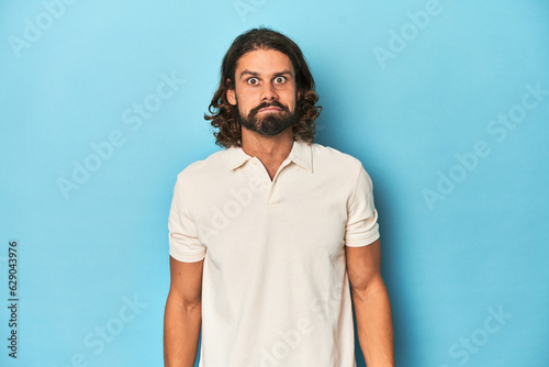 Long-haired man in a white polo, blue studio shrugs shoulders and open eyes confused.