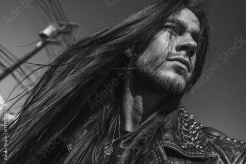 Long-haired man wearing a studded leather jacket looking away with a confident expression