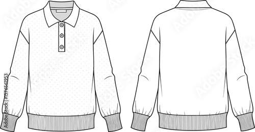 Long-sleeve polo shirt vector template, front and back fashion sketch, dotted fabric texture design, collar placket detail, garment mockup, editable apparel layout