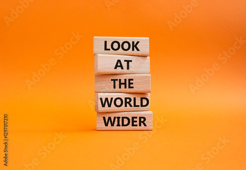 Look at the world wider symbol. Wooden blocks with words Look at the world wider. Beautiful orange background. Business and Look at the world wider concept. Copy space.