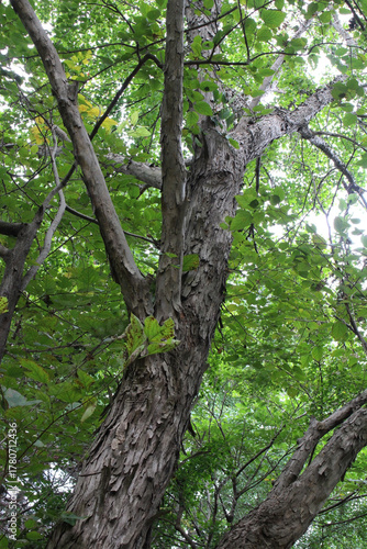 Look up at a tree with lush green leaves in late summer background. Tree trunk and branches with foliage back lit by the sunlight in natural forest.