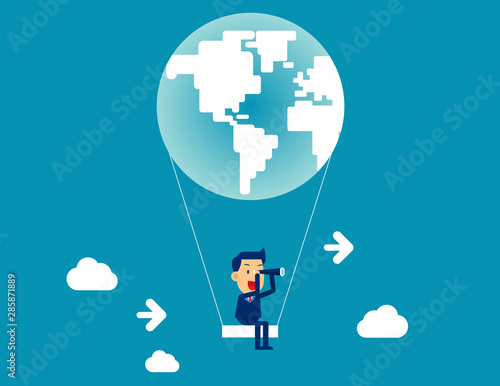 Looking telescope in globe air balloon. Concept business searching vector illustration, Business flat cartoon, Cloud - Sky