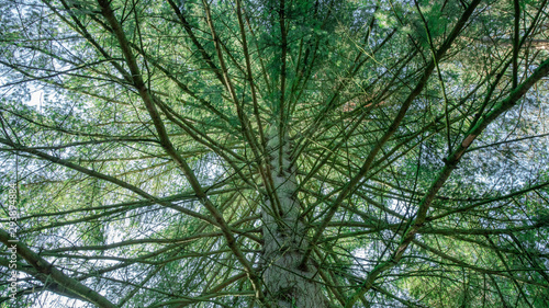 Looking up at branches of an impressive green tree in the forest.