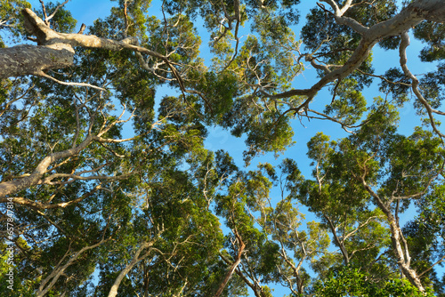 Looking up at Eucalyptus Treetops, Benandarah, Murramarang National Park, New South Wales, Australia