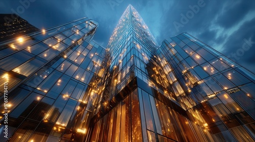 Looking up at Impressive Glass Skyscrapers With Illuminated Windows in the Evening, Night Sky Above