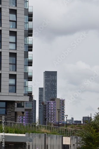 Looking up at modern buildings with a cloudy sky background. Taken in Manchester England.