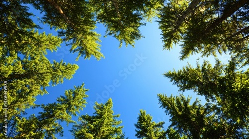 Looking up at pine trees from below against a bright blue sky, nature background.
