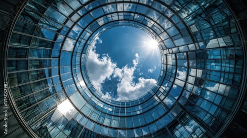 Looking up through a circular glass structure, the bright blue sky is visible along with fluffy clouds and radiant sunlight illuminating the space below.