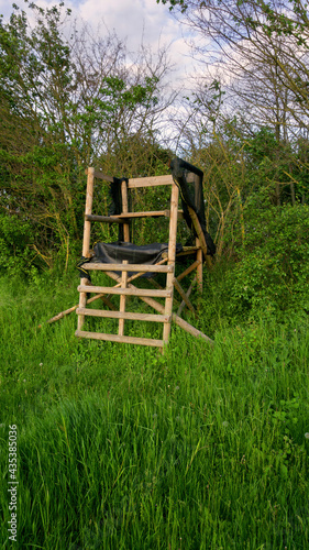 Lookout wooden ladder seat, also known as hunter's seat, hunter's high seat between the trees in nature for observing wild animals, animal world covered with camouflage hunting camouflage net