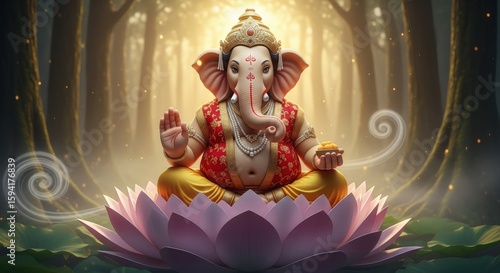 Lord ganesha seated on a lotus flower in a forest