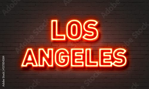 Los Angeles neon sign on brick wall background.