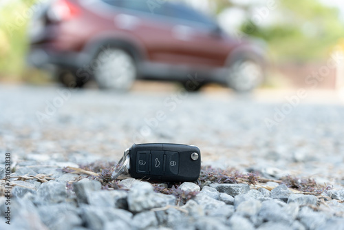 Lost car keys on the ground, Car keys dropped on the floor or fall lying on the street home front. Walking Away From Lost Car Key, can not transport, express, rush time, wast time, emergency