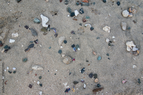 lot of colorful stones corals and shells lying in the fine sand of the beach