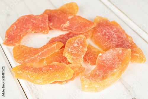 Lot of whole dried orange papaya piece on white wood