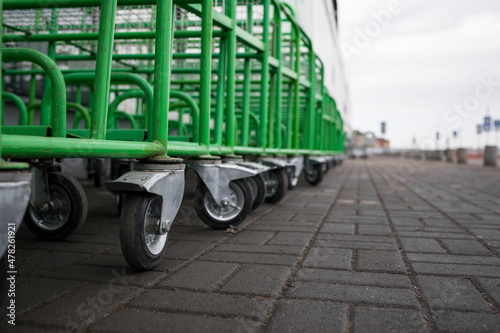 lots of cargo delivery carts in airport ground service parking . wide angle view