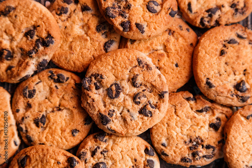 Lots of delicious homemade chocolate chip cookies. View from above, close up