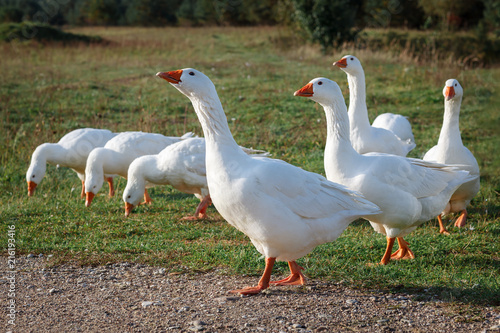 Lots of nice white gooses grazing on the meadow at evening, and looking for food