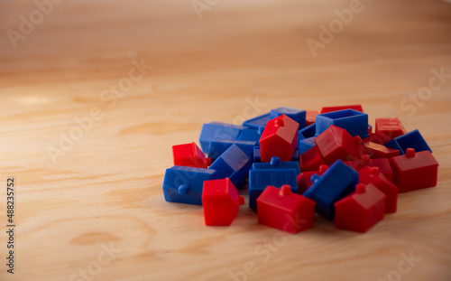 Lots of red and blue houses. Real estate concept, high economy. With wooden background.