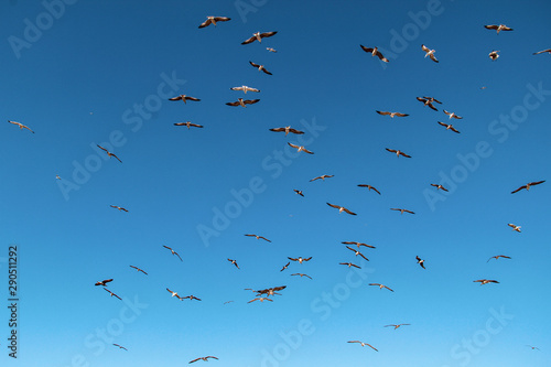 Lots of Seagulls fly freely clear blue sky in Istanbul, Turkey