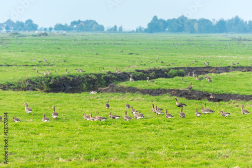 Lots of wild geese searching food on the meadow