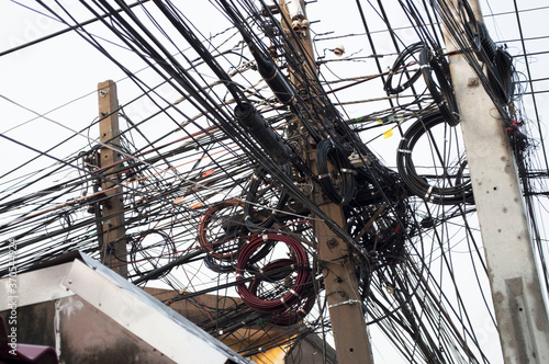 Lots of wires mess with wires, transformers, and telephone lines on old or street-side electric poles in Bangkok, Thailand.