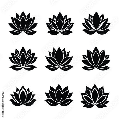 Lotus flowers Silhouette Bundle, featuring floral designs perfect for mugs, books, T-shirts, and more. Ideal for printing, crafting, or digital projects. Download now.