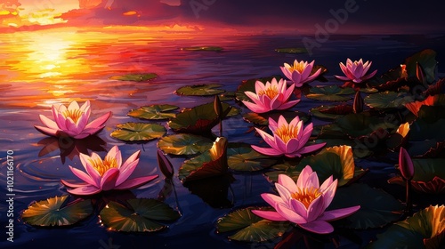 Lotus flowers blooming in serene waters during a colorful sunset.