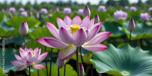 Lotus flowers in a pond surrounded by green leaves with soft pink and white petals under bright daylight