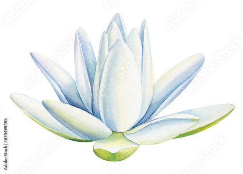 Lotus white flower on an isolated white background, flora watercolor illustration, water lily botanical painting
