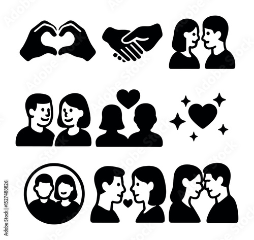 Love and Intimacy Icons. Solid, filled icons set of love and intimacy expressions: heart hands, touch gesture,