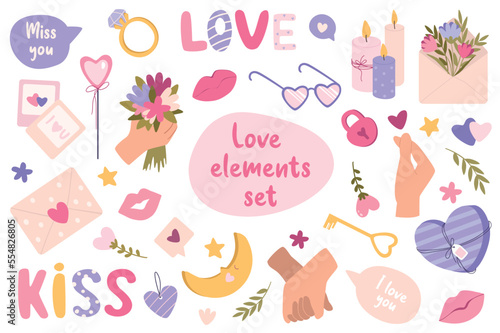 Love and romantic isolated elements set in flat design. Bundle of hearts, proposal rings, chat bubbles, photo, gift, flowers, kiss, glasses, candles, letter, valentines and other. Vector illustration.
