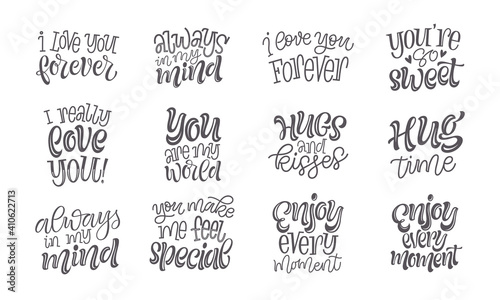 Love and romantic lettering. Happy Valentine's Day vector illustrations. Set of calligraphic phrases, words and slogans for greeting card, prints or social media design. Unique handwritten elements