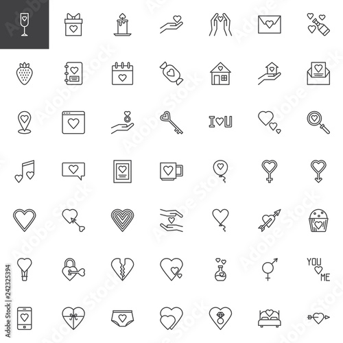 Love and Valentine's Day line icons set. linear style symbols collection, outline signs pack. vector graphics. Set includes icons as Calendar page, I love you text, Romantic music, Heart gift box