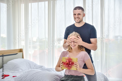 Love Couple giving gift box in bedroom happiness in love Valentine's day concept